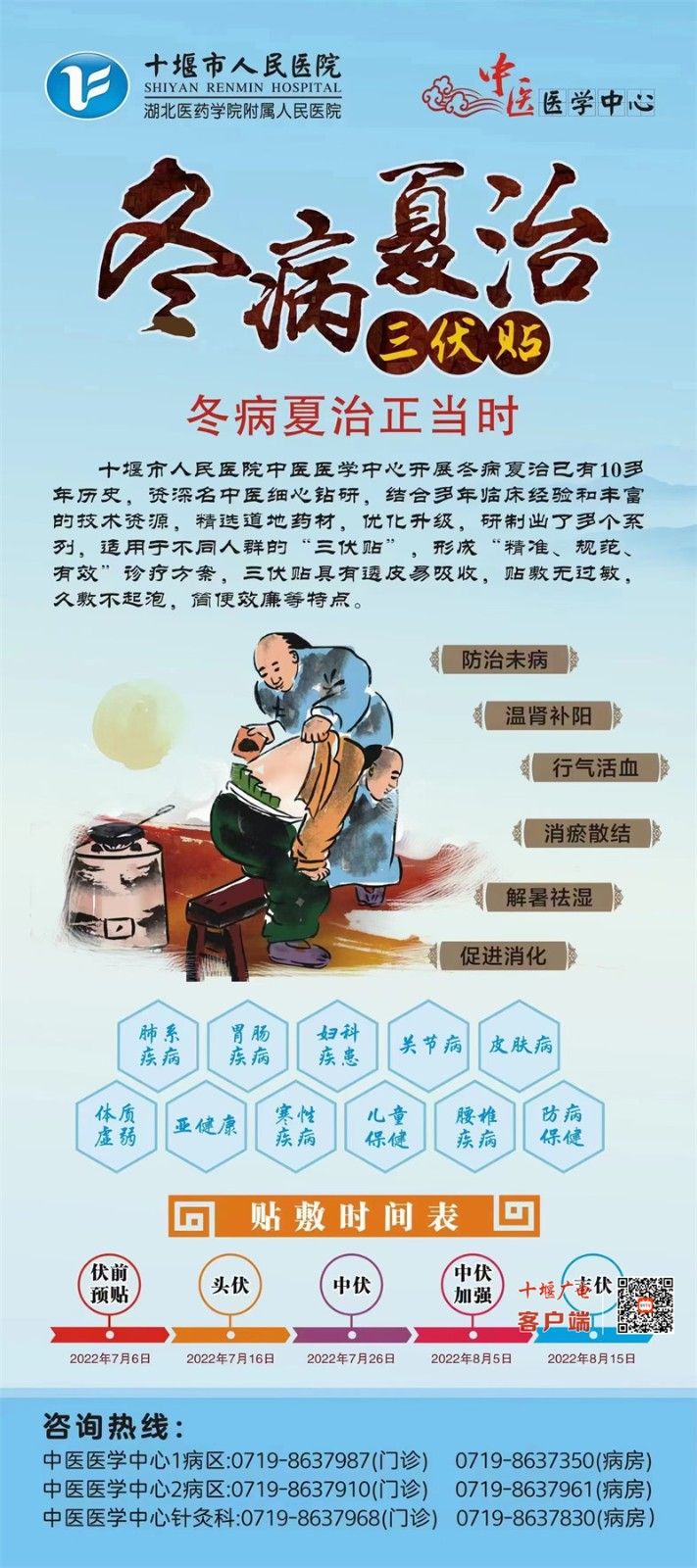 十堰廣電訊(全媒體記者 張焱)三伏天是一年中陽(yáng)氣最旺盛的季節(jié),也是“冬病夏治”的黃金時(shí)間,此時(shí)貼敷“三伏貼”能激活人體免疫力,達(dá)到增強(qiáng)機(jī)體抵抗力的作用。今天上午,記者從市人民醫(yī)院中醫(yī)醫(yī)學(xué)中心了解到:中心開展的“冬病夏治”三伏貼于今日“火熱”開貼。