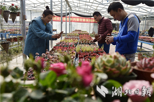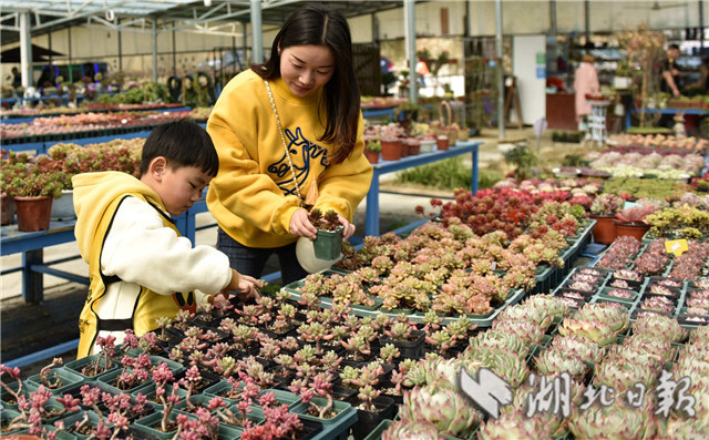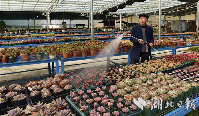 3月10日,在湖北省通城縣馬港鎮(zhèn)界上村東山大屋多肉植物種植大棚社員忙著移栽、管理、銷(xiāo)售多肉植物。連日來(lái),湖北省通城縣馬港鎮(zhèn)界上村東山大屋多肉植物種植花卉大棚里春意盎然,五顏六色的多肉小盆栽連綿成花海,顏色豐富多彩,吸引游客拍照、購(gòu)買(mǎi),開(kāi)展親子活動(dòng)。