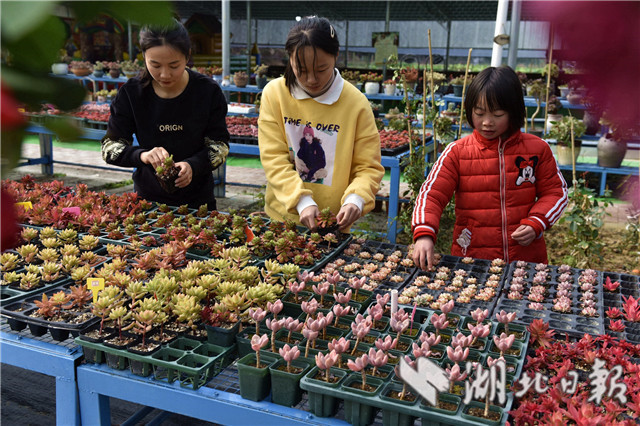 3月10日,在湖北省通城縣馬港鎮(zhèn)界上村東山大屋多肉植物種植大棚社員忙著移栽、管理、銷(xiāo)售多肉植物。