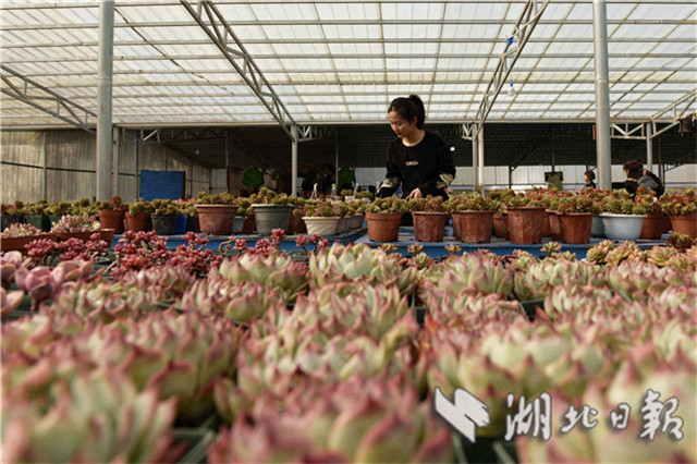 據(jù)了解,該大棚是當(dāng)?shù)乩杳?、杜靜、黎姣等5名創(chuàng)業(yè)女青年返鄉(xiāng)創(chuàng)辦的。2016年初,她們共同投資100萬(wàn)元返鄉(xiāng)創(chuàng)辦青葉多肉植物種植專(zhuān)業(yè)合作社,種植面積30畝,近千個(gè)品種,借助“互聯(lián)網(wǎng)+”平臺(tái),把多肉植物產(chǎn)品放到網(wǎng)上銷(xiāo)售,年產(chǎn)銷(xiāo)多肉植物30多萬(wàn)株。社里還帶動(dòng)附近10多個(gè)村近百名建檔立卡貧困農(nóng)戶(hù)發(fā)展花卉種植,成為當(dāng)?shù)剞r(nóng)民脫貧致富新路徑,助力鄉(xiāng)村振興。(視界網(wǎng)劉建平攝)