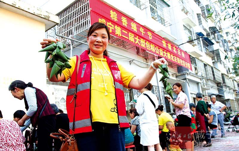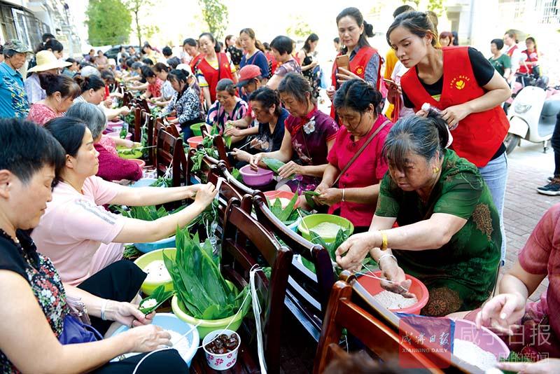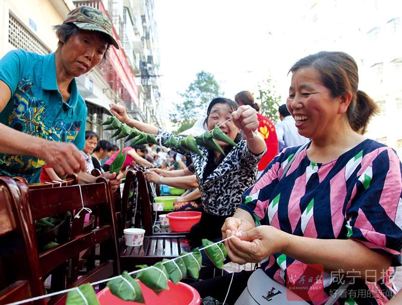 “瞧,這個粽子包得真好,不僅個頭飽滿,而且有棱有角”“蜜棗餡的粽子,還沒煮就已經(jīng)覺得很香了”……4號下午,在咸安區(qū)永安街道辦事處北正街社區(qū)幸福家園小區(qū),擠滿了社區(qū)居民,咸寧第二屆大型包粽子大賽北正街社區(qū)分賽正在進行,居民們邊包粽子邊拉家常,好不熱鬧。