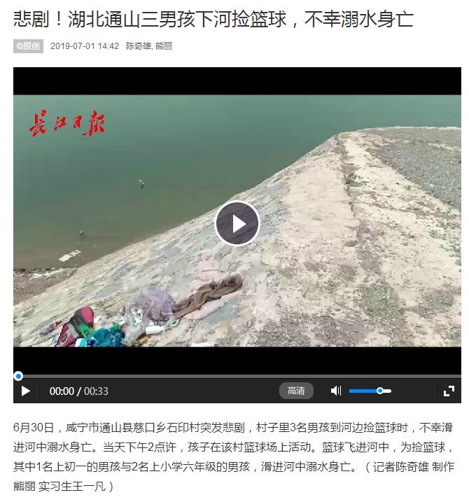 6月30日,咸寧市通山縣慈口鄉(xiāng)石印村突發(fā)悲劇,村子里3名男孩到河邊撿籃球時,不幸滑進河中溺水身亡。當天下午2點許,孩子在該村籃球場上活動。籃球飛進河中,為撿籃球,其中1名上初一的男孩與2名上小學六年級的男孩,滑進河中溺水身亡。(記者陳奇雄 制作 熊麗 實習生王一凡)