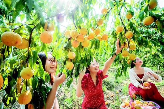 8月7日,嘉魚(yú)縣新街鎮(zhèn)嘉多寶果蔬、世外萄園的果園里碩果累累,游客體驗(yàn)著采摘的快樂(lè)。近年來(lái),嘉魚(yú)縣新街鎮(zhèn)在351國(guó)道沿線(xiàn)建設(shè)“十里花果長(zhǎng)廊”,大力發(fā)展農(nóng)旅融合經(jīng)濟(jì)。(湖北日?qǐng)?bào)全媒記者陳勇通訊員耿海軍馬映攝)