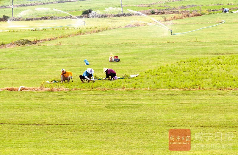 12日,赤壁市茶庵嶺鎮(zhèn)云臺山村青青草坪種植基地,工人正對草坪實施除雜、噴灌。