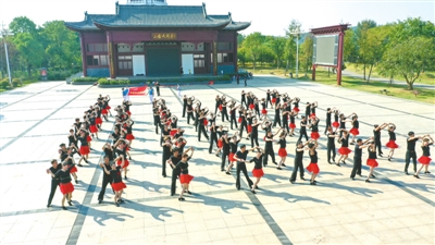 9月8日,在嘉魚二喬公園,嘉魚交誼舞團(tuán)隊(duì)100多名舞者,正在錄制嘉魚交誼舞團(tuán)隊(duì)與軍運(yùn)會(huì)同行《兵兵三步踩》,該視頻將在武漢軍運(yùn)會(huì)期間播放。