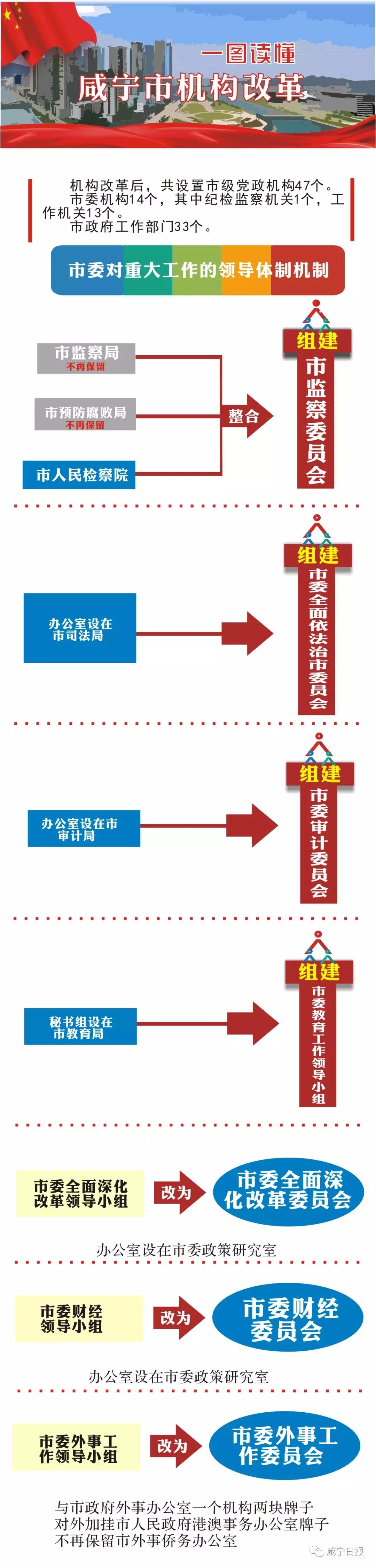 我市召開(kāi)機(jī)構(gòu)改革動(dòng)員大會(huì),標(biāo)志著我市機(jī)構(gòu)改革全面啟動(dòng)。根據(jù)省委省政府批準(zhǔn)的《咸寧市機(jī)構(gòu)改革方案》,本輪機(jī)構(gòu)改革后,市本級(jí)共設(shè)置黨政機(jī)構(gòu)47個(gè)。市委機(jī)構(gòu)14個(gè),市政府工作部門33個(gè)。改革方案還對(duì)黨政直屬事業(yè)單位實(shí)施了限額管理,并進(jìn)一步規(guī)范了黨政派出機(jī)構(gòu)置。