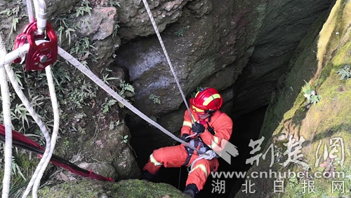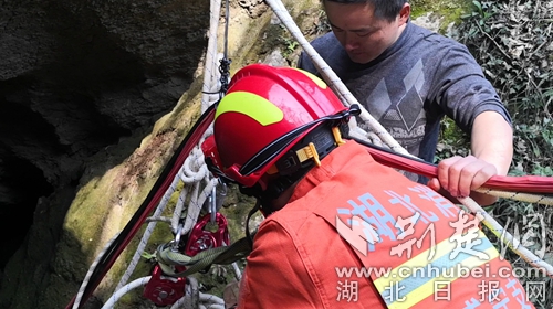 因消防車無法抵達,消防員帶上救援工具,徒步半個多小時迅速趕赴事發(fā)現(xiàn)場開展救援。到達現(xiàn)場后,發(fā)現(xiàn)一名三十多歲男性在一個10多米的深洞內呼救。經(jīng)與被困者和現(xiàn)場群眾溝通了解,此洞名為藏龍洞,是一個未經(jīng)商業(yè)開發(fā)的深洞,有著悠久的歷史傳說,引來無數(shù)探險者,這名男子也是因為好奇,下洞后體力不支無法再攀爬出洞被困洞底。中隊指揮員根據(jù)現(xiàn)場情況,立即利用救援繩索做好安全支點,消防員何聰點降至洞底查看被困者情況,所幸洞內空氣流暢,被困者無二次受傷的危險,消防員利用隨身攜帶的全身吊帶將被困者固定好后,經(jīng)洞外消防員齊力,最終經(jīng)過20多分鐘的救援,被困人員被成功營救出山洞。