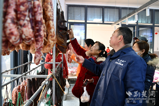 在肉類攤位前,剁了20多年肉砧板的胡金山割肉的手麻利多了——他邊賣肉,邊招呼顧客,今天喜遷新市場(chǎng),瞧這秤也足足的。排著長(zhǎng)隊(duì)購(gòu)買“兩頭烏”豬肉的顧客不時(shí)盯著屏幕上中央電視臺(tái)拍攝采訪這位養(yǎng)豬大戶的專題片,有的掃一掃二維碼,看養(yǎng)豬場(chǎng)實(shí)況。