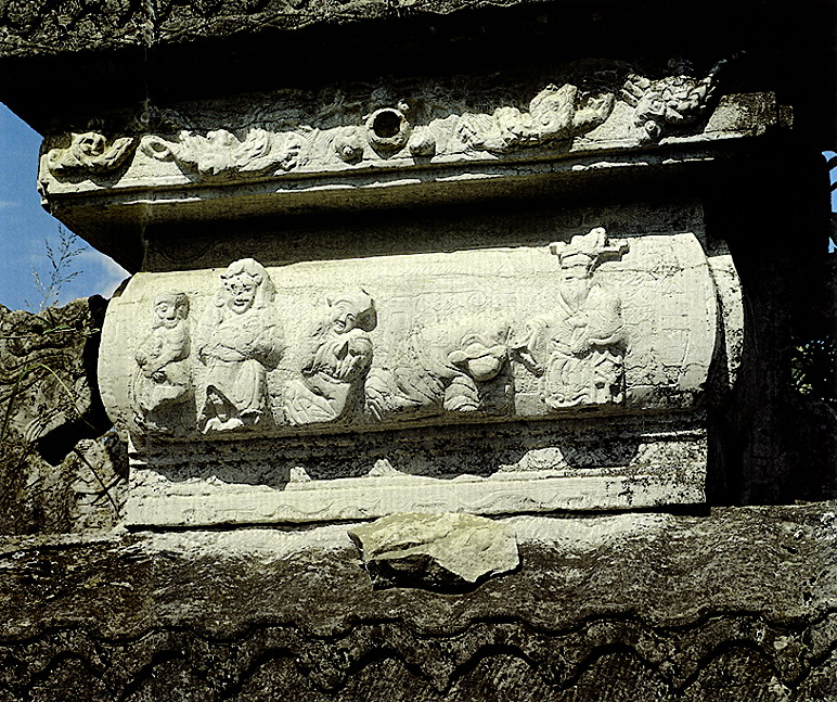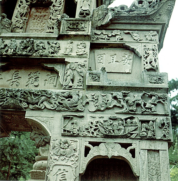 石雕 湖北省北有秦嶺東沿的武當山、大別山、桐柏山,西接云貴高原,東南為幕阜山脈環(huán)繞,中部是寬闊的江漢平原。山區(qū)產石料,為石雕提供了豐富的用材;平原燒泥土制磚瓦,鐫以圖案美化建筑。民間石雕、磚雕分布,與地形大體一致。保康石雕題材廣泛,大致分為日常生活、倫理教化、神話傳說、戲文故事、花鳥蟲魚、書文楹聯(lián)六類。